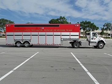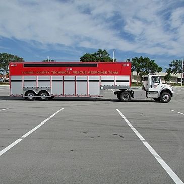 Lorain County EMA Ohio 38 foot tractor drawn USAR unit by EVI. Unit features 19 walk around compartments with numerous roll out trays and pull out tool boards, adjustable shelves, onboard self contained diesel generator, multiple charging stations, ramps for robots, roof compartments and ladder access to the roof. Unit is totally self contained and car run on it's own.